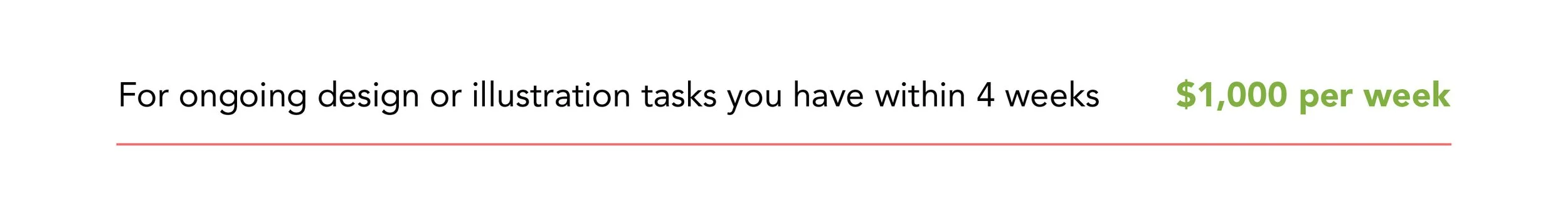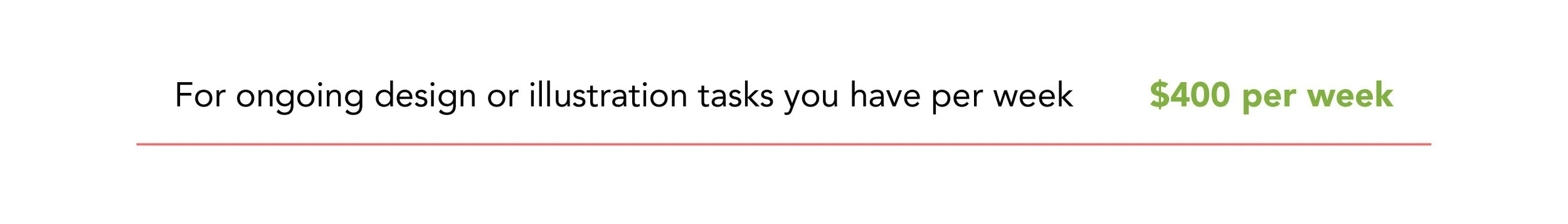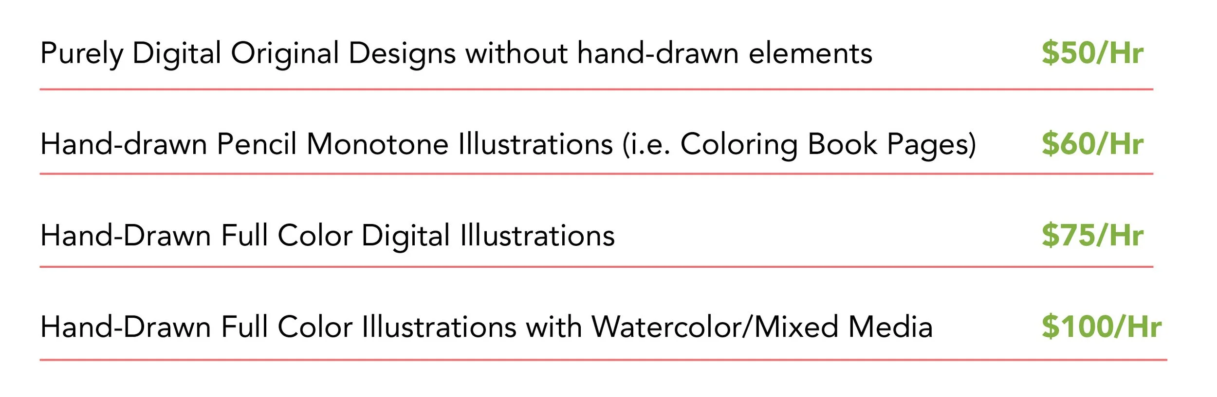 Design/ Illustration Hourly Illustration: Design: Illustration Specific ProjectsSINGLE FULL COLOR ILLUSTRATION SERIES of ILLUSTRATIONS / CHILDREN’S or GRAPHIC NOVEL ILLUSTRATIONS Design & Branding PackagesCan include both graphic design and illustrationLOGO & SOCIAL MEDIA PACKAGE: LOGO & COMPLETE BRANDING STYLE GUIDE BOOK / MAGAZINE LAYOUT On-Call Design Rates4 HOURS A WEEK ON-CALL DESIGN 8 HOURS A WEEK ON-CALL DESIGN 20 HOURS A MONTH ON-CALL DESIGN